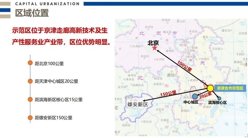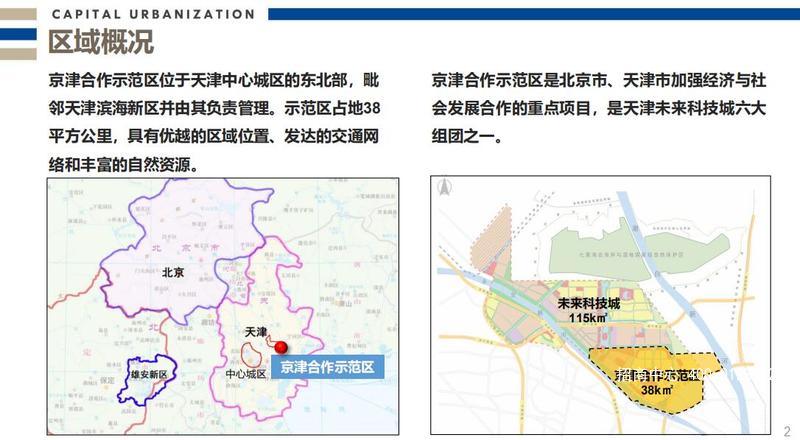 京津合作示范區位于天津中心城區的東北部,毗鄰天津濱海新區并由其負責管理。示范區占地38平方公里,具有優越的區域位置、發達的交通網絡和豐富的自然資源。